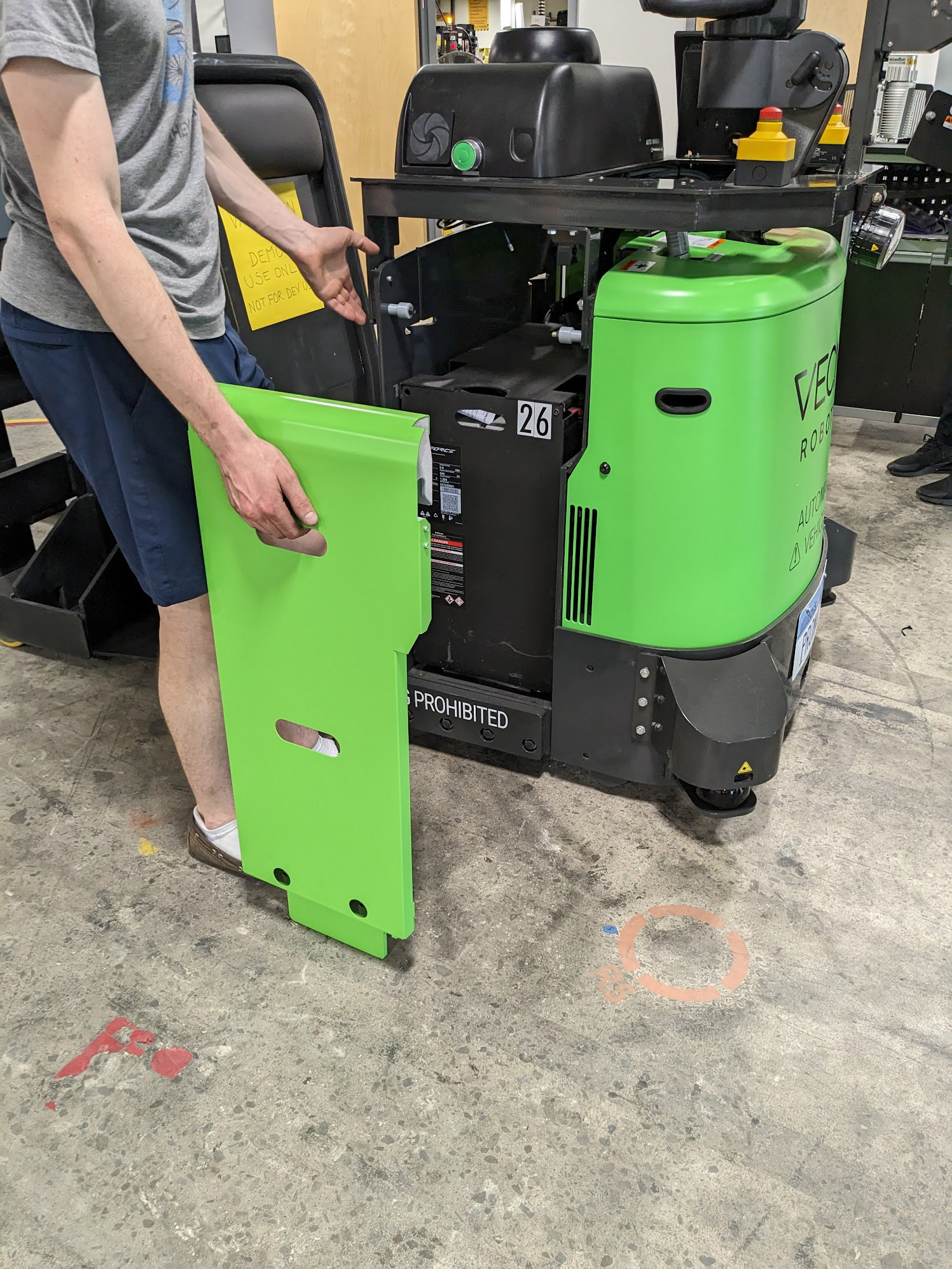 I designed and fabricated a battery cover for the Vecna Robotics automated forklift. This cover integrated an existing plate that holds the battery in place during travel, while adding branding area for warehouse companies and improving the experience of changing the battery for operators.